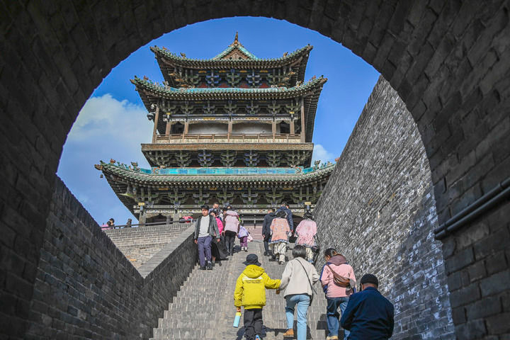 游客登上山西省晉中市平遙古城城墻游覽觀光(2025年4月4日攝)。(新華社發 梁生仁/攝)
