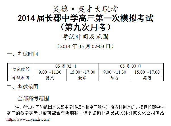 炎德英才大聯(lián)考長郡中學(xué)2014屆高三第一次模擬(第9次月考)考試時(shí)間和范圍(2014.05.0