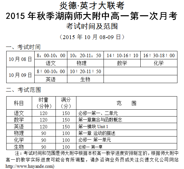 炎德英才大聯(lián)考師大附中2015年秋季湖南師大附中高一第一次月考考試時間和范圍(2015.10.08-09)