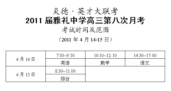 上一篇:炎德英才大聯(lián)考雅禮中學2011屆高三第七次月考考試時間和范圍