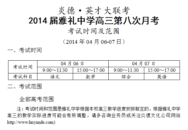 來源:炎德文化點擊:2014-04-03 14:53:08收藏本文當前位置:考試范圍 雅禮中學 高三 正文