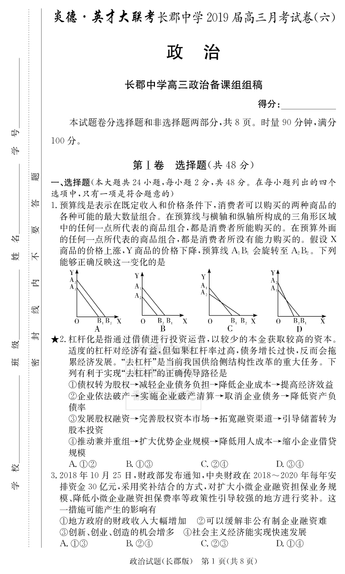 【政治】炎德英才大聯(lián)考2019長郡中學(xué)高三6次月考