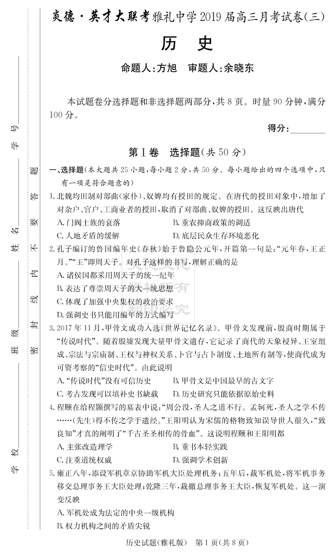 【歷史】炎德英才大聯考2019雅禮中學高三3次月考
