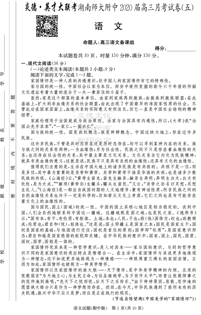 2026湖南師大附中新高考考前小題訓練·語文