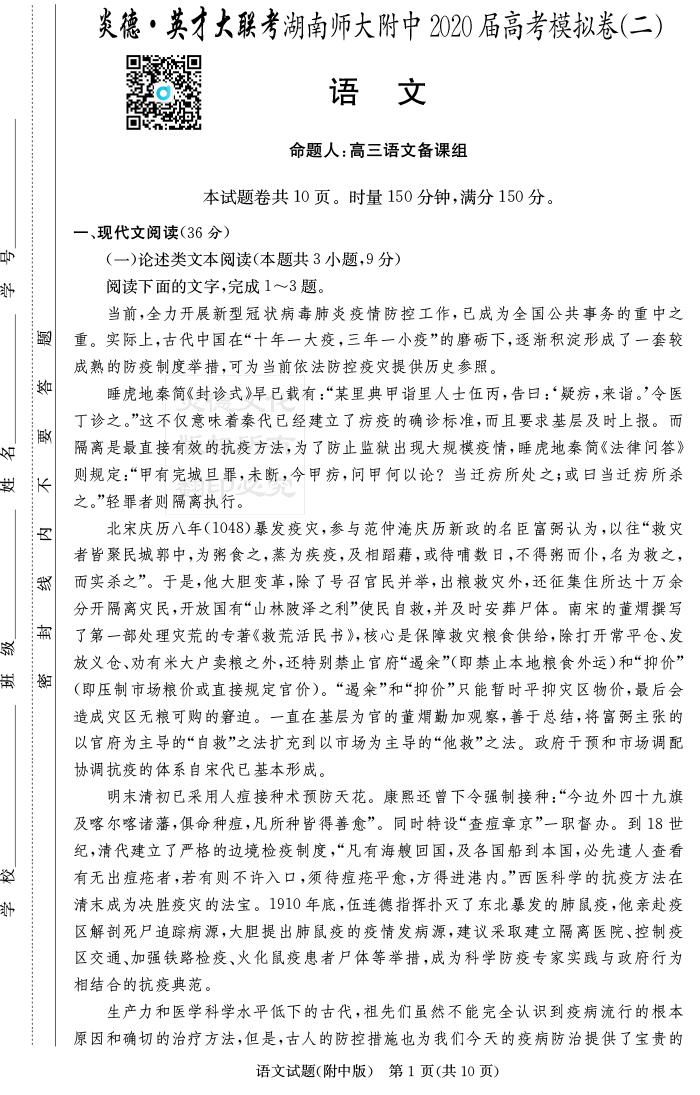 2026湖南師大附中新高考考前小題訓練·語文