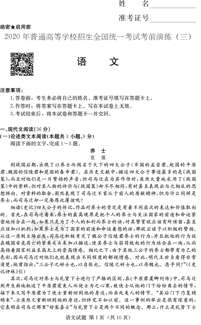 上一篇:【英語】2020年普通高等學校招生全國統一考試考前演練(三)