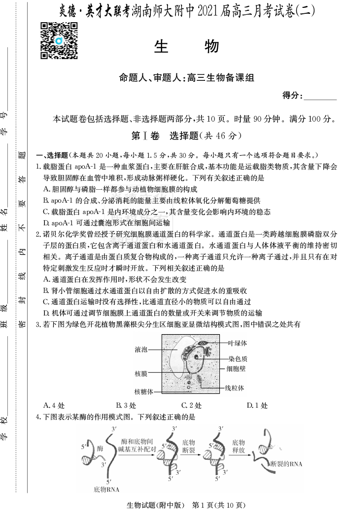 2026湖南師大附中新高考考前小題訓練·生物