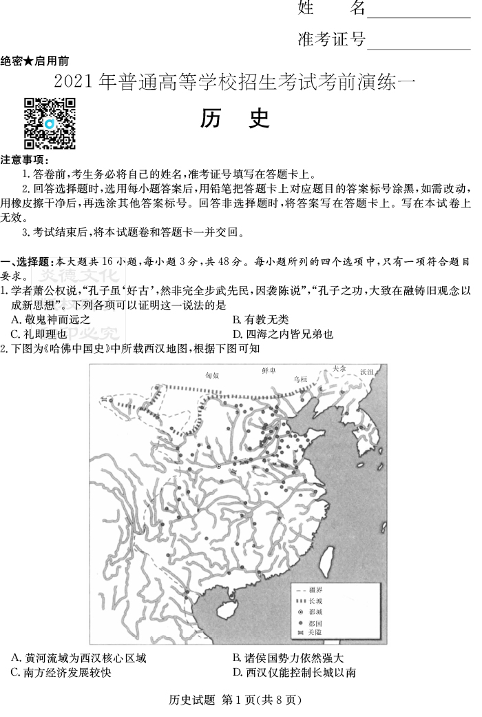 下一篇:【生物】2021年普通高等學校招生全國統一考試考前演練(一)