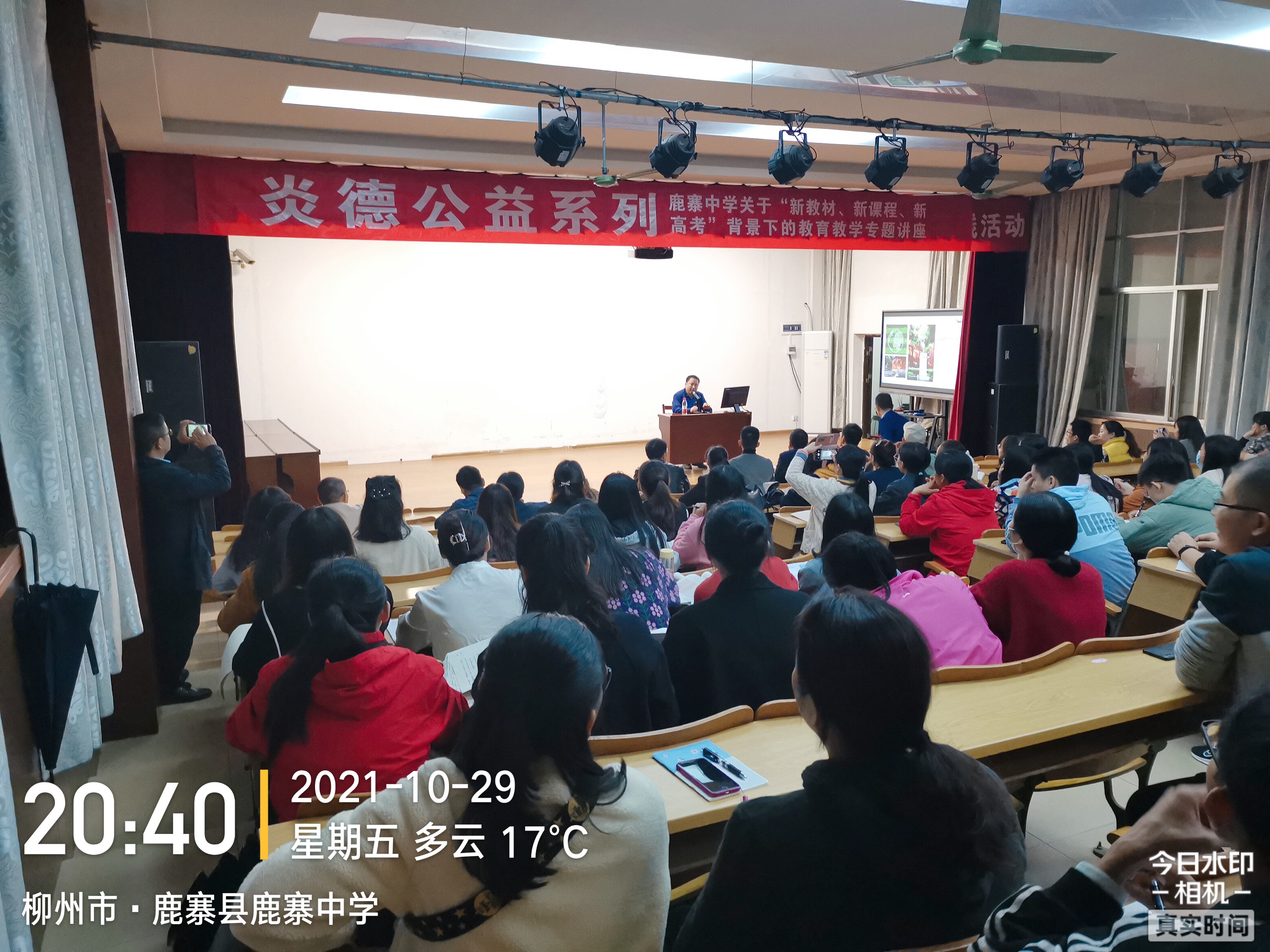 鹿寨中學全校80多名高一老師認真聽課,做筆記。