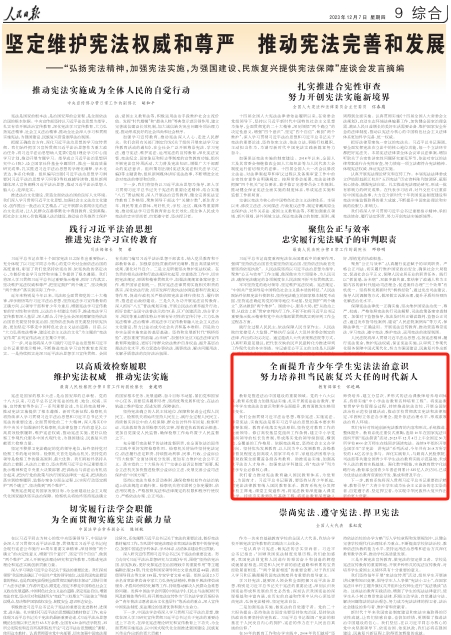 下一步,教育系統(tǒng)將深入貫徹習(xí)近平總書記重要指示精神,教育引導(dǎo)廣大青少年學(xué)生成為社會主義法治的忠實崇尚者、自覺遵守者、堅定捍衛(wèi)者,為實現(xiàn)中華民族偉大復(fù)興作出新的更大貢獻(xiàn)。(“弘揚(yáng)憲法精神,加強(qiáng)憲法實施,為強(qiáng)國建設(shè)、民族復(fù)興提供憲法保障”座談會發(fā)言摘編 本文刊發(fā)于《人民日報》2023年12月07日第09版)